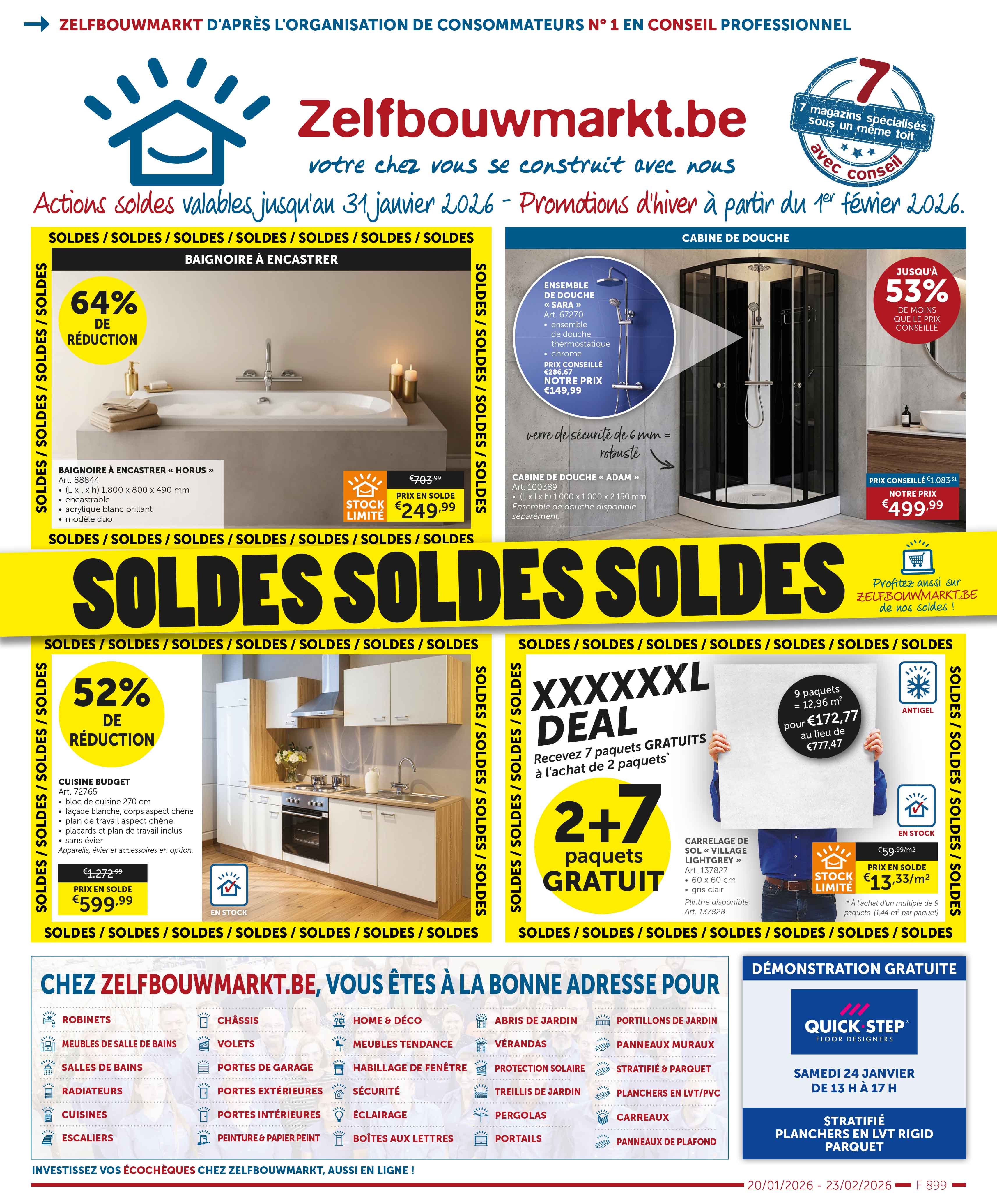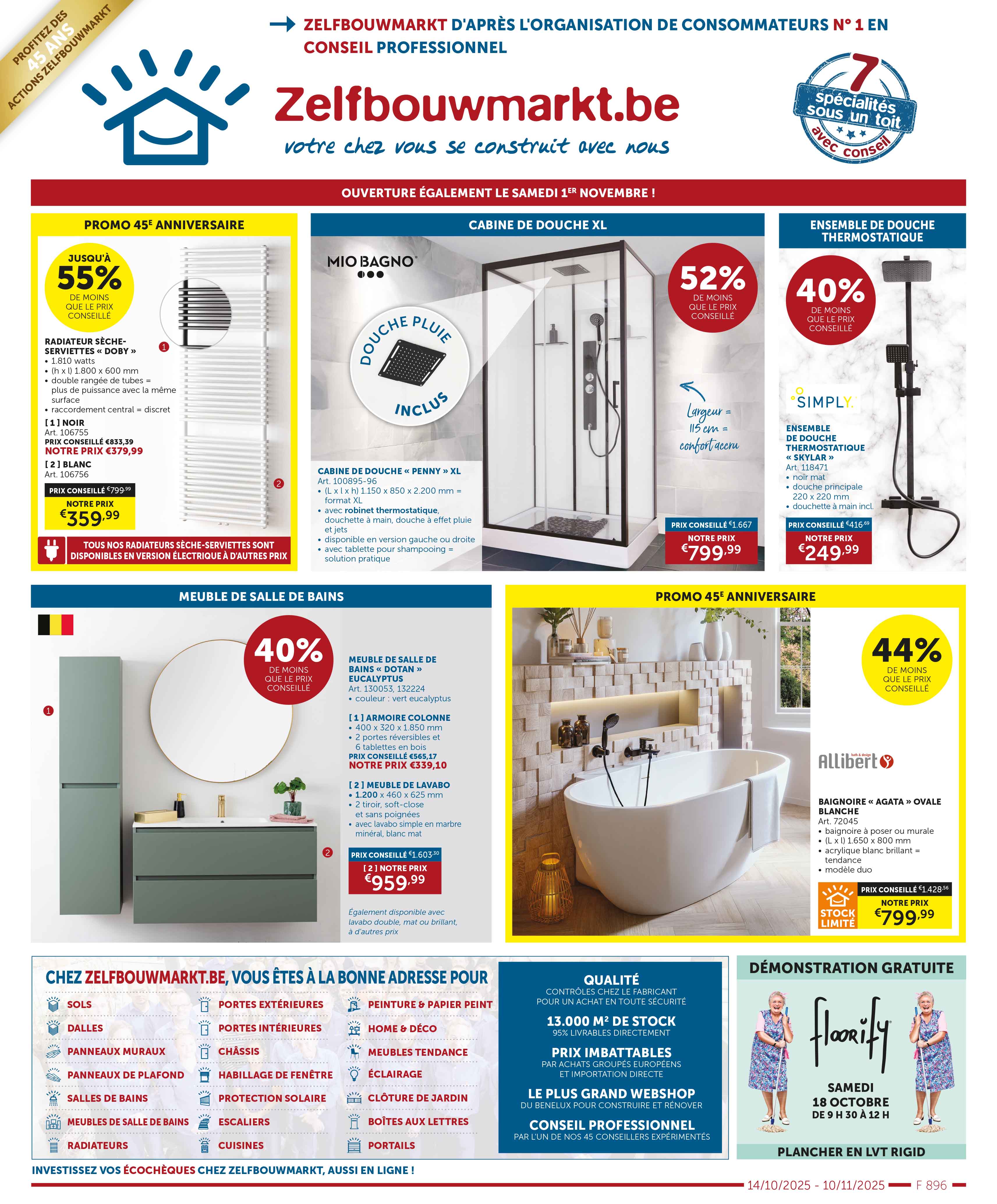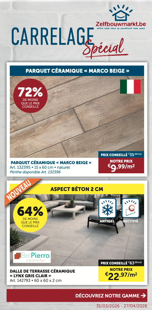 Découvrez les dernières dépliantes et restez informé de nos promotions actuelles, de nos remises saisonnières et de nos offres spéciales ! Vous trouverez ici tout ce dont vous avez besoin pour votre prochain projet de (re)construction. Feuilletez nos brochures et découvrez les meilleures offres sur toutes sortes de produits d'intérieur, meubles de salle de bain, portes intérieures, cuisines, carrelages, et bien plus encore.