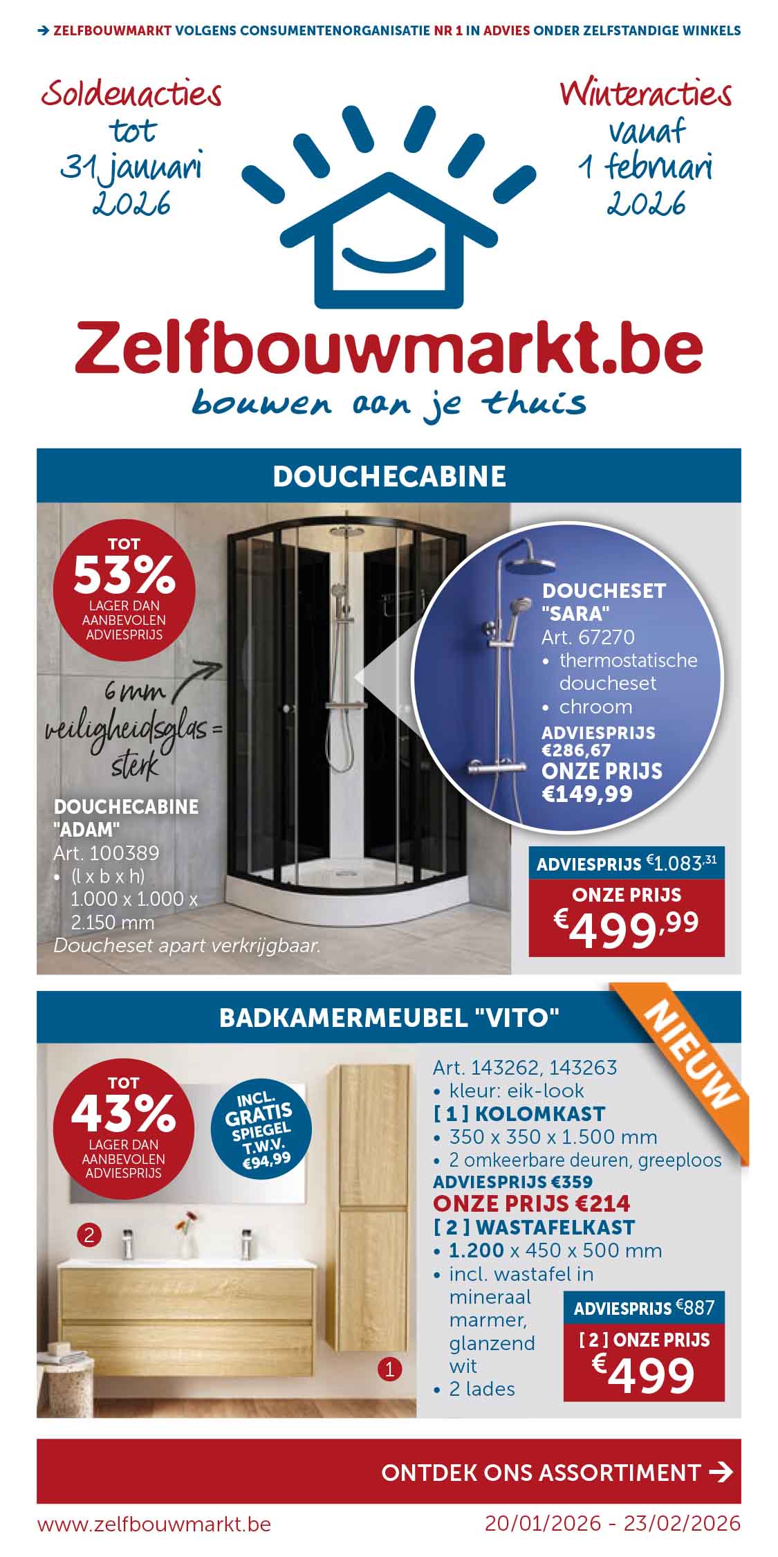 Ontdek de nieuwste Zelfbouwmarkt folders en blijf op de hoogte van onze actuele promoties, seizoenskortingen en speciale aanbiedingen! Hier vind je alles wat je nodig hebt om te besparen op jouw volgende (ver)bouwproject. Blader door onze folders en ontdek de beste deals op allerlei interieurproducten, badkamermeubels, binnendeuren, keukens, tegels, en nog veel meer. Onze folders zijn niet alleen online beschikbaar, maar ook fysiek in onze showroom.